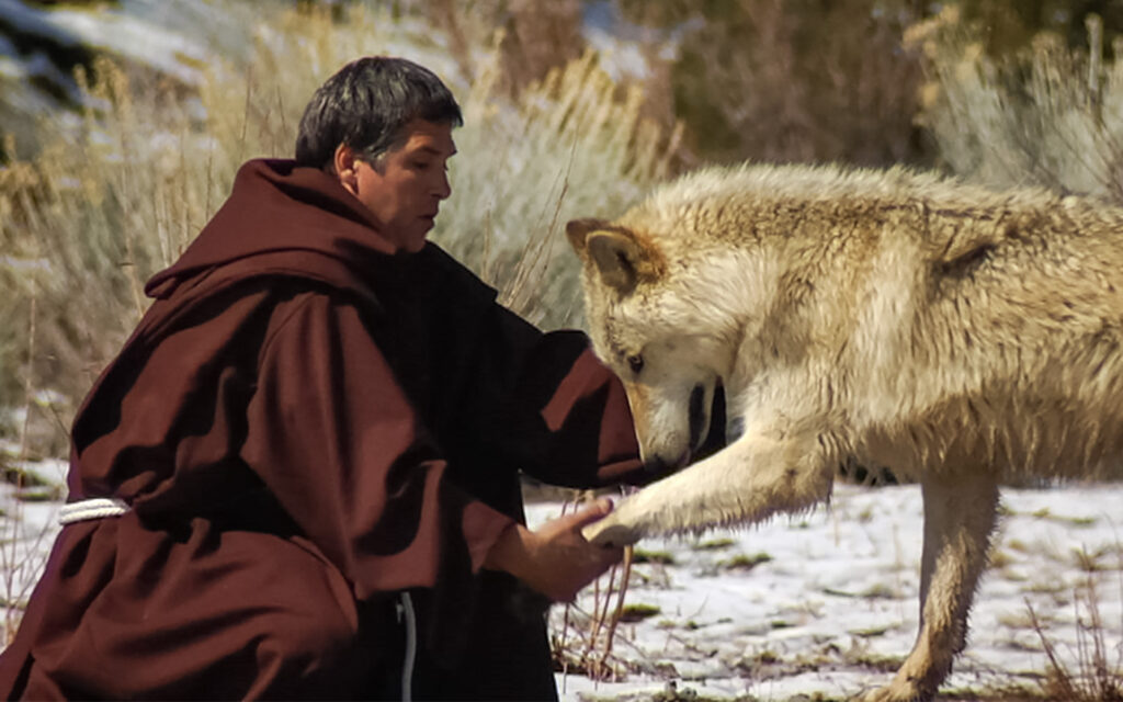 Seeing the wolf, Francis felt a connection. He made the sign of the cross and called the wolf to meet him in peace under the grace of the Lord. The wolf watched as Francis came closer. “Come Brother Wolf, I will not hurt you. Let us talk in peace.” The wolf froze in mid step. The wolf struggled with doubt and uncertainty. Finally, understanding that Francis meant him no harm, the wolf walked to Francis and sat back on his haunches, ready to listen.
